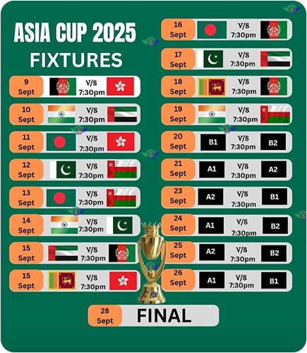 Asia Cup 2025 starts on September 9 and ends with the final on September 28. Matches are scheduled in the evenings and some in the afternoon.